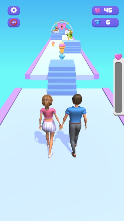 约会冲冲冲是一款超级好玩的休闲跑酷手游,玩家们需要在游戏中牵着对象的手在跑到上跑步,路上会有很多约会可能用到的道具,你可以捡道具送给对象,每多一个道具就会多一些好感值,在更短的时间内将好感值拉满的话就能完成游戏了。