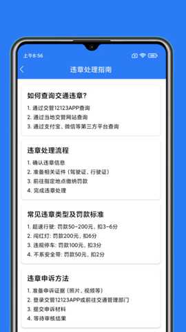 1、内置的违章处理指南则提供了详细的处理方法,让用户能够随时查阅,了解妥善处理各种交通违规。