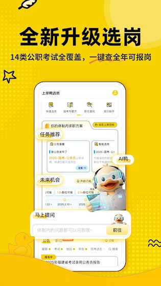上岸鸭公考是一款为公职考试备考者打造的移动学习平台,整合了海量真题资源与专业名师课程,提供系统化的复习方案,帮助考生精准掌握考点,根据个人基础动态调整每日练习内容,确保学习效率,是公职人员选拔考试的重要辅助工具。