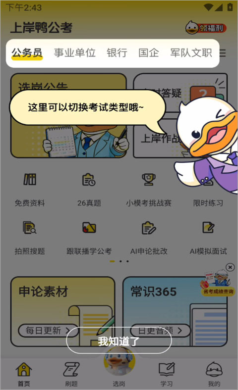 1、首页上方可选择并切换适合自己的考试类别(公务员、事业单位、教师招聘等)