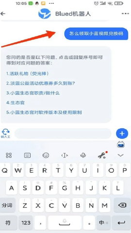 点击在线客服,如下图,发送怎么领取小蓝视频兑换码,看到客服的回复就知道怎么做了