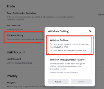 只有当收款人地址是币安账户时,才能免除手续费且确保资金即时到账。确认通过提现进行站内转账之前,请确保目标地址属于币安账户。