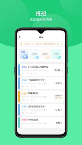 课后延时服务是一款学生课堂、课程表应用为公立学校的小学生提供了一种课后素质学习课程的选课平台。这个应用在APP中提供了丰富多样的线下素质课程供学生和家长选择报名和购买的目标是充分利用孩子们放学后的下午三点半到晚上的这段,解决家长下班与孩子放学无法对接的,并且促进学生的综合素质发展。