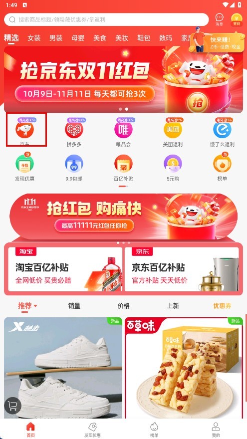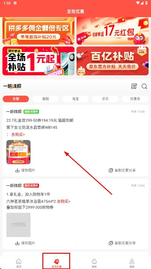 4、点击页面底部的【发现优惠】功能按钮,可浏览各类优惠信息,包括拼多多佣金翻倍专区、百亿补贴等。