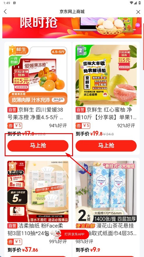 3、进入限时抢页面后,选择感兴趣的商品(如京鲜生四川爱媛38号果冻橙),点击【马上抢】功能按钮参与抢购。