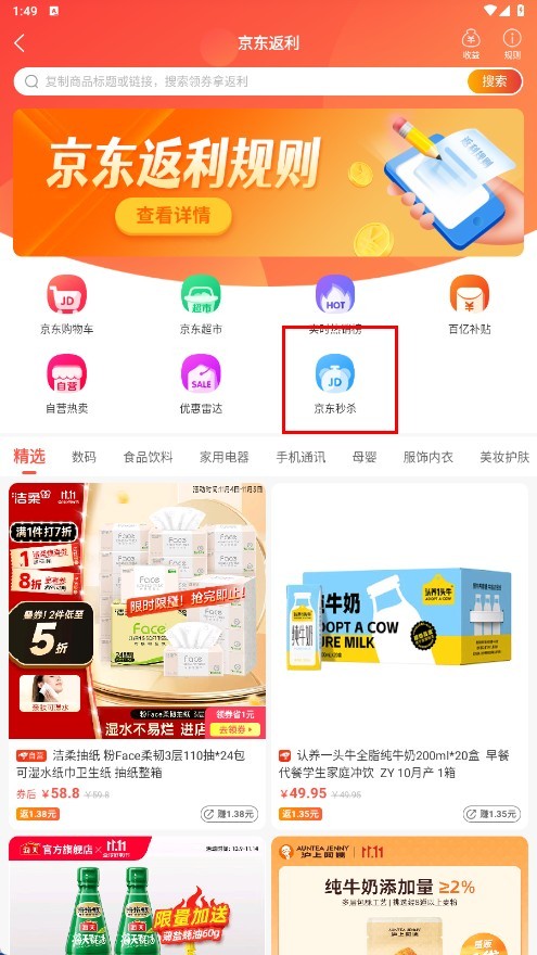 2、在京东返利页面中,点击【京东秒杀】功能按钮,跳转至京上商城限时抢页面。