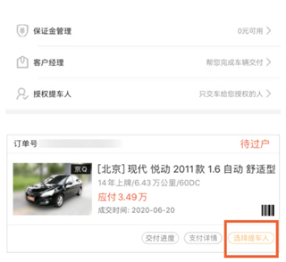 8、付款后,可在App内查看车辆交易进度。完成过户后,交付经理会联系用户到场提车。如本人无法到场,可设置授权提车人,提车人携带证件到场提车即可。
