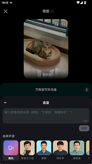 上传任意静态图片,应用可自动为其添加自然的动作与表情,使人物或角色“活”起来,适用于人像、动漫、宠物等多种素材类型。 2、文生视频 通过输入文字描述场景、动作或氛围,系统自动生成匹配的动态视频,将抽象想法快速具象化为可视内容。 3、多镜头叙事 支持在单次生成中自动切换多个镜头视角,如推拉、摇移、跟拍等,提升视频的节奏感与故事性。 4、音频自动生成 根据内容自动匹配背景音乐、环境音效或角色台词,实现声音与画面的协调统一,无需额外配音处理。 5、模板快速套用 提供大量分类明确的热门模板,覆盖节日、潮流、搞笑、大片等主题,用户可一键生成同款爆款视频。使用介绍