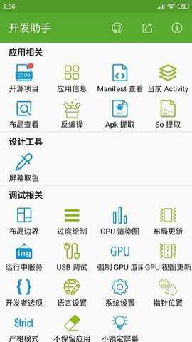 1、 开发助手还提供了一系列实用的功能,如显示布局边界、显示GPU过度绘制、显示布局更新、强制GPU渲染、显示GPU视图更新、显示指针位置、严格模式、不保留活动、不锁定屏幕等。