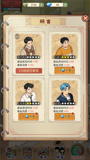 4、点击顾客按钮可以查看解锁的角色,消耗钻石可以对顾客升星来获得更多收益。