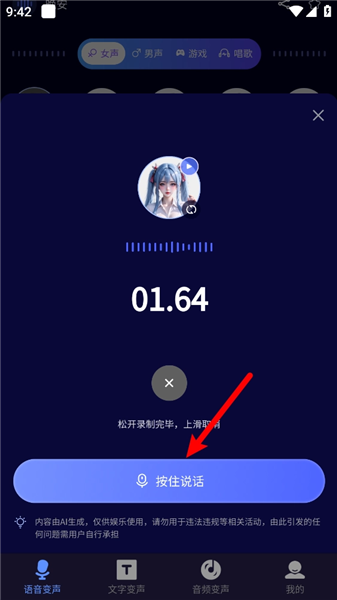 4、如图所示,点击"按住说话"进行录音后即可变声。