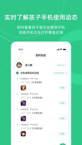 2、家长端可以实时查看孩子手机使用动态,应用、游戏今日使用的时长。