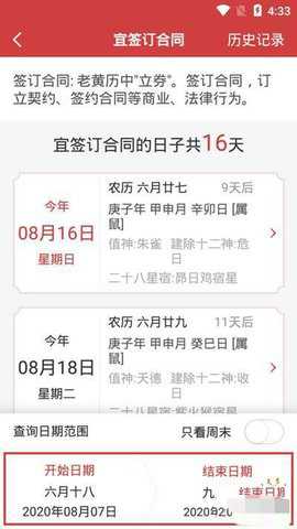 4、最后我们就可以在【查询日期范围】内查看到所有适合签订合同的黄道吉日啦!