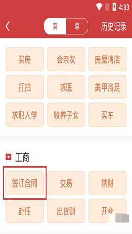 3、然后在选择查询的吉日类型中选择一个,这里小编选择【工商】下方的【签订合同】一项;