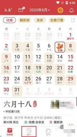 1、打开手机中的万年历APP,在下方的功能栏中选择【黄历】进入查询宜忌信息;