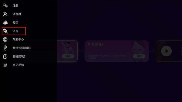 7、点击左上角,我们可以自己设置语言、调音器等,还能进入社区和其他吉他爱好者一起学习。