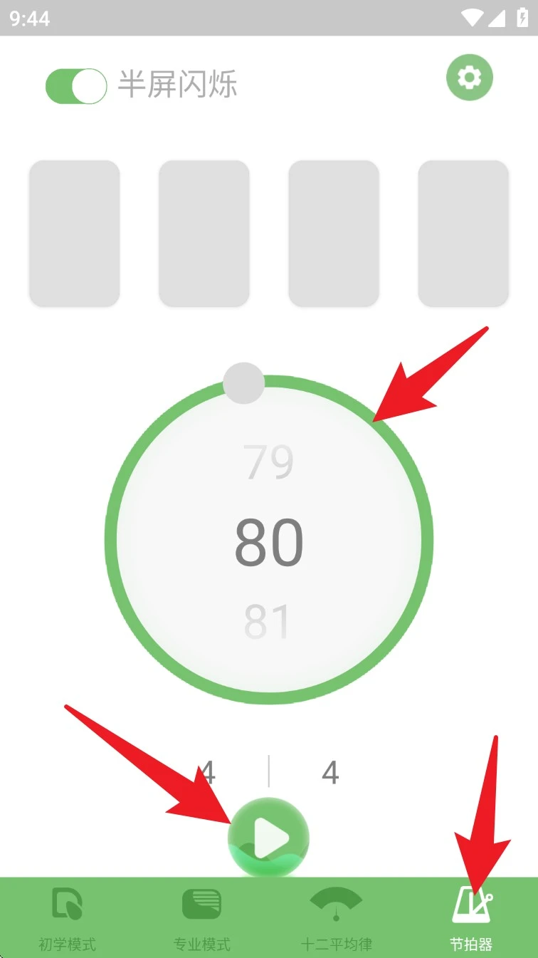 5.进入“节拍器”功能模块,可自由设置节奏速度与拍号,点击开始即可跟拍练习。
