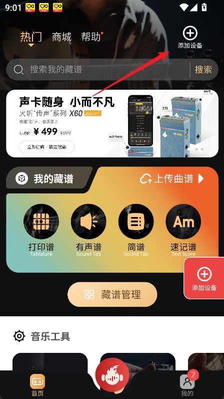 1、打开火听翻谱器App,主界面右上角可见“添加设备”按钮,点击进入设备搜索绑定页面。