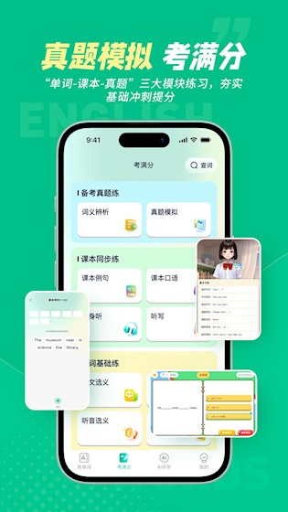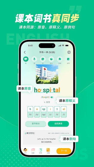 3、 课文同步点读:支持点击课本任意单词即可播放标准发音,并展示详细释义与实用例句,实现随时随地跟读学习。