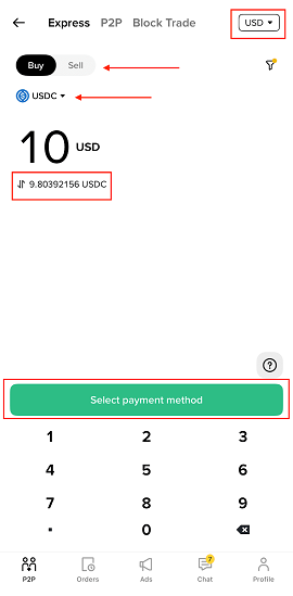 2. 进入快速区后,选择需要交易的法币。选择购买,并选定要买入的加密货币。然后点击“互换”图标,输入您想交易的法币或加密货币数量。
