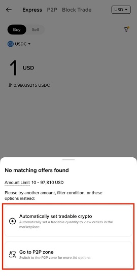 4. 若未能匹配到符合所选支付方式或交易金额的广告,请尝试切换至【自定义区】,或允许系统自动填写“可交易加密货币数量”。