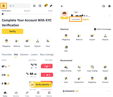 1. 登录币安账户,在APP首页点击【认证】或【身份核验】。
