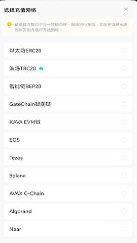 注意事项:确保币种与平台支持的币种一致,选择正确的链名称,支付网络矿工手续费。