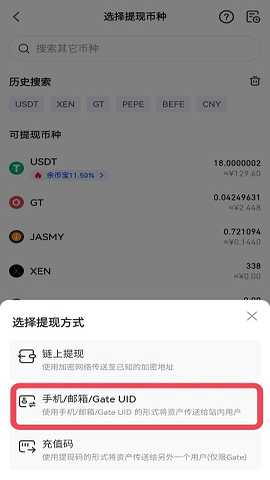 然后搜索并点击要提现的币种,接着选择“手机/邮箱/Gate UID”。