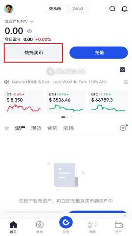 打开Gate.io手机App,在首页找到“快捷买币”便捷入口。