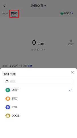 点击“快捷买币”,跳转至“快捷交易”页面,选择“卖出”,然后选择要卖出的币种(如USDT/BTC/ETH/DOGE),买卖方式可以按照卖出数量或兑换金额进行卖出。