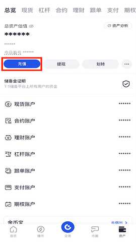 或者在“现货账户”中,使用搜索栏搜索需要充值的币种,点击进入该币种页面后,选择“充值”。
