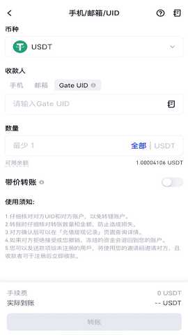 进入“手机/邮箱/Gate UID页面”,按照页面提示输入提现币种、对方账户(对方手机/邮箱/Gate UID)、转账数量,确认信息无误后,点击“转账”。