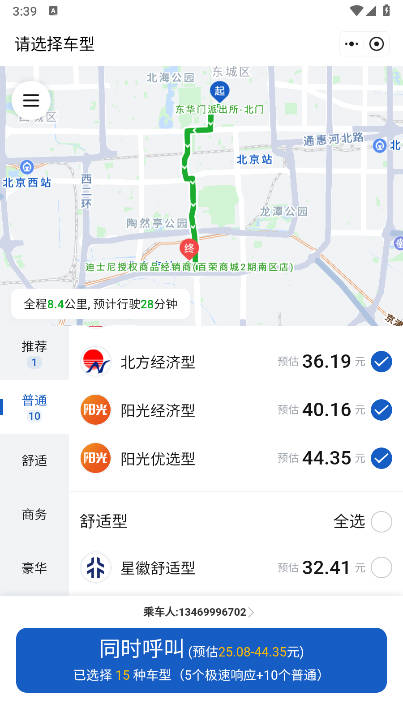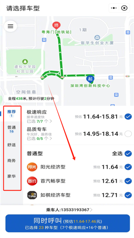 4、还可以根据自己的需求选择普通、舒适、商务等不同车型,所有价格都是透明化的