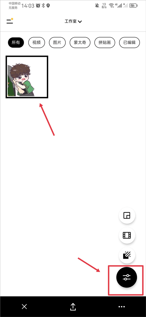 2、导入或拍摄的图片会显示在上方,选中照片后点击右下角编辑器进入编辑界面。