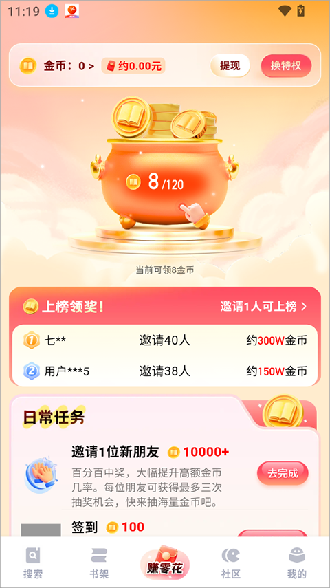 3、app中可以通过签到、完成任务等方式赚取金币,金币可提现当零花钱