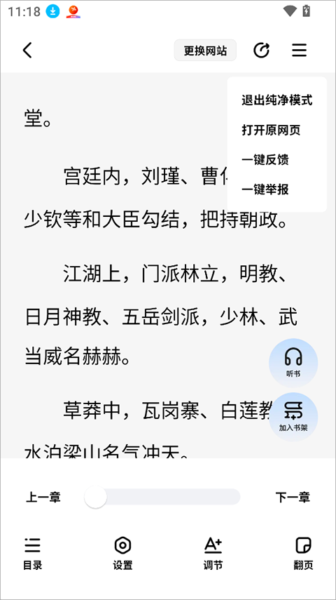 2、浏览小说时,app支持纯净模式浏览,也支持目录跳转、字体调节等