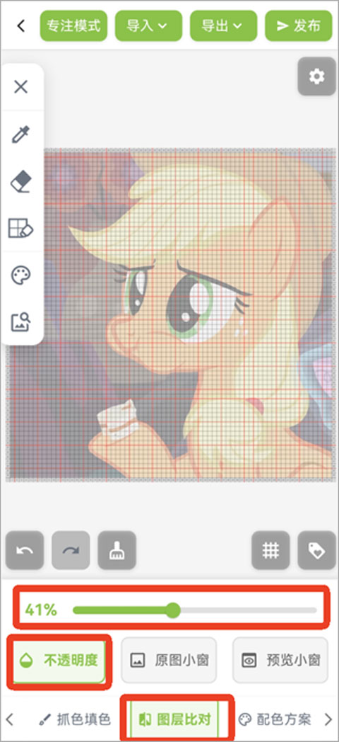 - 色库选色:左滑工具栏 → 点击“图层对比”调低透明度 → 点击“抓色取色” → 选择“色库” → 从211种拼豆标准色中点击使用。