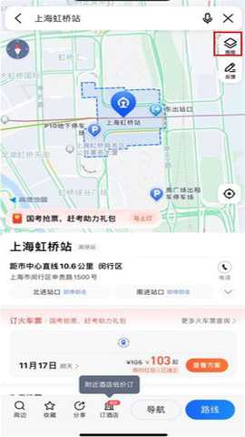 2、搜索到地点后,点击右上角的【图层】切换选项,如图所示