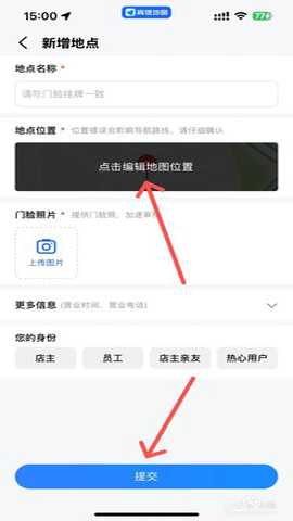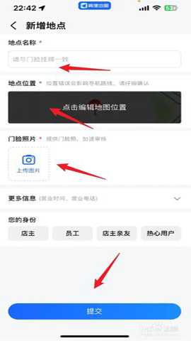 进入到新增地点界面,输入地点名称、地点位置、门脸照片,点击“提交”。