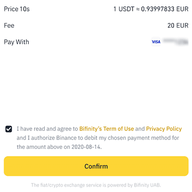 5.如果您已阅读并同意币安使用条款和隐私政策,请勾选复选框。一切就绪后,点击【确认】完成付款。