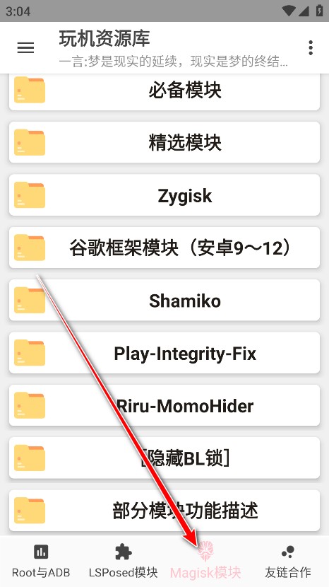 6、点击下方Magisk板块,包含必备模块、精选模块、谷歌框架模块等,点击进入即可查找对应资源。