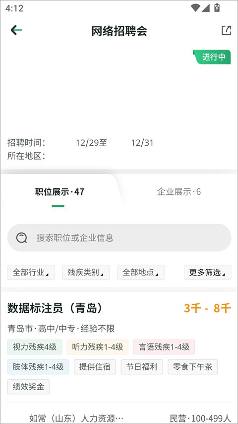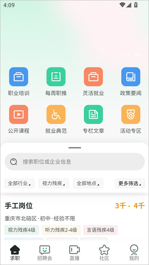 3、点击底部“求职”进入职位搜索页面,可根据“残疾类别”、“期望工作地”、“薪资范围”等条件进行筛选。