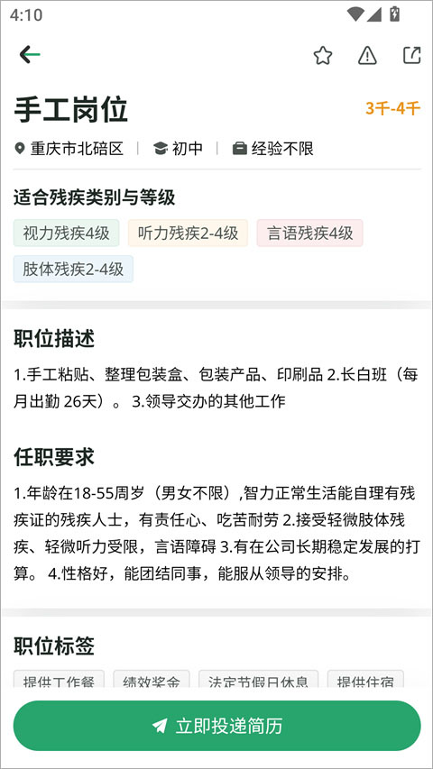 4、准确搜索:汇集海量真实可靠的招工信息,支持多条件精准筛选,助用户快速找到合适岗位。