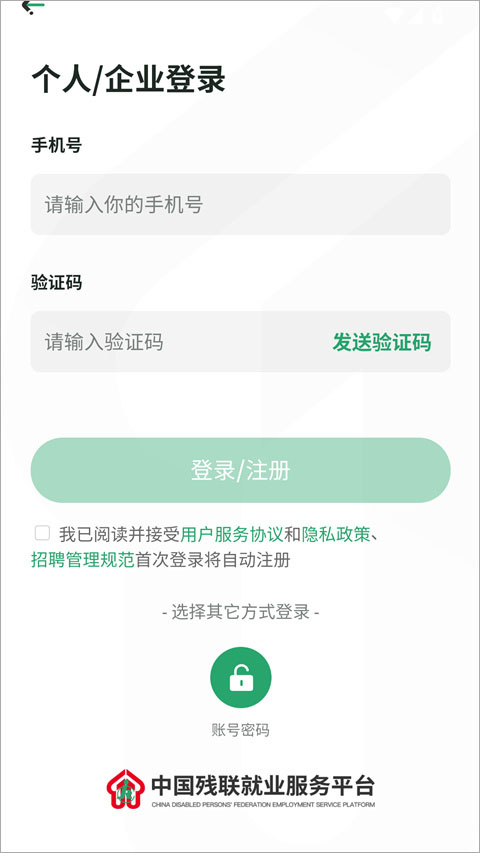 1、本站下载打开中国残联就业App,使用手机号完成注册登录。