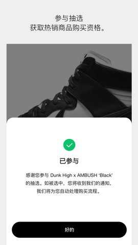 抢购活动: 用户可以参与各种限量鞋款的抽签购买活动,体验购鞋的刺激感,使用非常便捷。