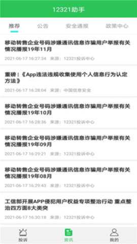 12321助手是中国互联网协会推出的垃圾信息举报处理平台,用户可以在这举报各种类型的骚扰短信息,防止不再被不良信息侵扰。实时更新的生活资讯,让你对网络有更加深层次的理解,提高自己的防范意识。