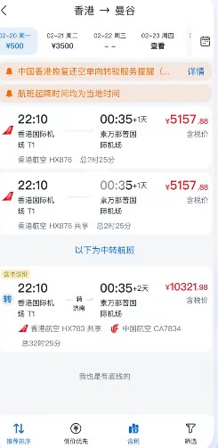 支持多种航班选择,可按价格、转机次数、飞行时间等条件筛选。