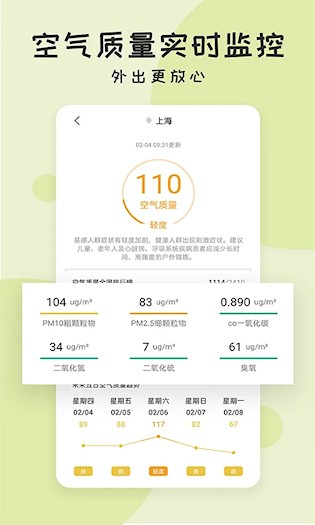 3、空气质量追踪:实时更新PM2.5、AQI指数与花粉浓度,提供健康风险预警与防护建议。