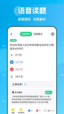 1、并且这个应用还支持免费下载,摩托车驾照朗读试题功能也使得长者可以更加友好地使用。