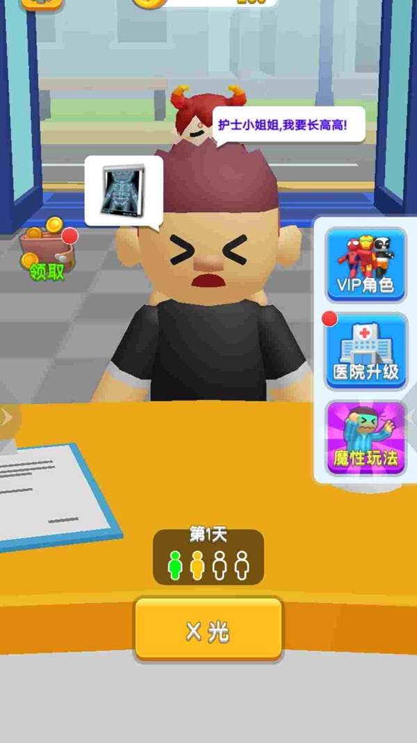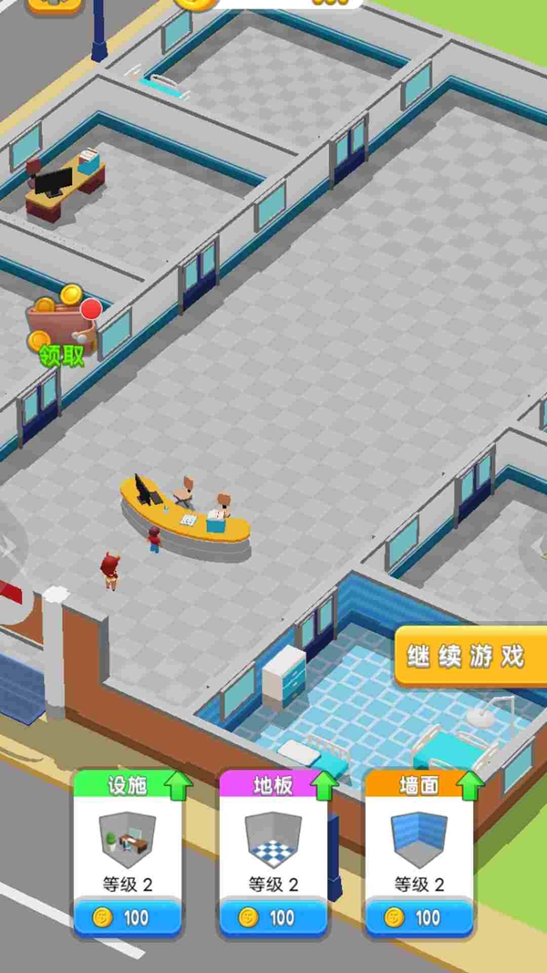 2、每次完成治疗都能领取奖励,使用金币来升级医院,解锁更多的区域,还能放置高级医疗设备。
